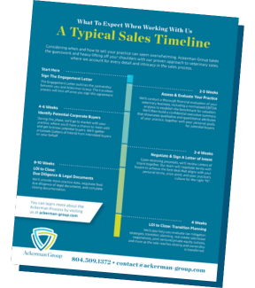 - Stability: Reassure the staff that a corporate group isn’t bringing in ‘replacement staff and veterinarians’ to take over. The buyer is usually excited about the hospital’s success, and the staff is a big part of that success, so everyone will keep their jobs.