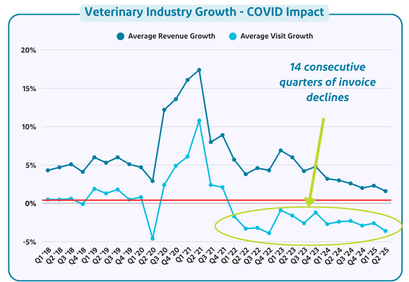 Unfortunately, the veterinary profession continues to struggle to drive positive visit growth. As evidenced in the chart below, IDEXX’s proprietary practice data set shows that revenue growth is slowing further and the industry has now experienced 14 consecutive quarters of declining invoices. Q2 2025 marked one of the worst quarters we have seen during this 3.5 year period with visits down -3.6%.