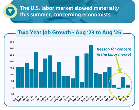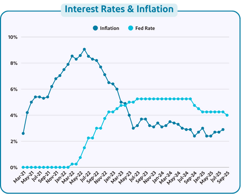However, despite these inflation levels, the Federal Reserve cut interest rates in September, in what is anticipated to be the first in a series of reductions aimed at boosting economic growth. The Fed’s challenge, at present, is balancing the need to boost the economy and job growth through lower interest rates, while not intensifying the rising prices for goods and services (i.e. inflation) brought on by Trump’s tariffs.