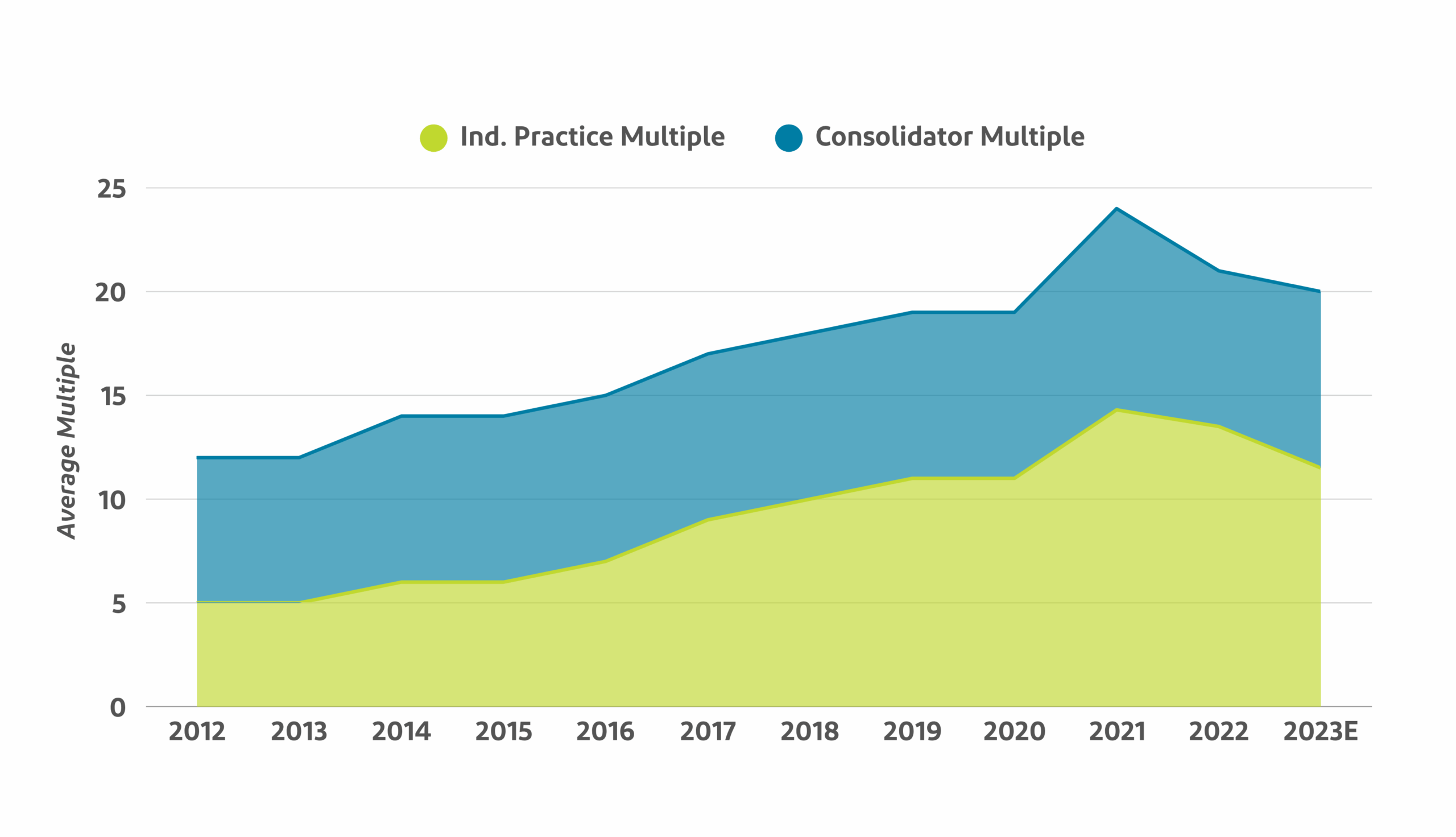On the chart below, you can see the clear relationship between practice prices and consolidator prices. In 2012, individual practices sold for 5-6x profits or EBITDA. In the second half of 2021, Ackerman Group saw average multiples approaching 15x and they have declined in 2022 and early 2023.