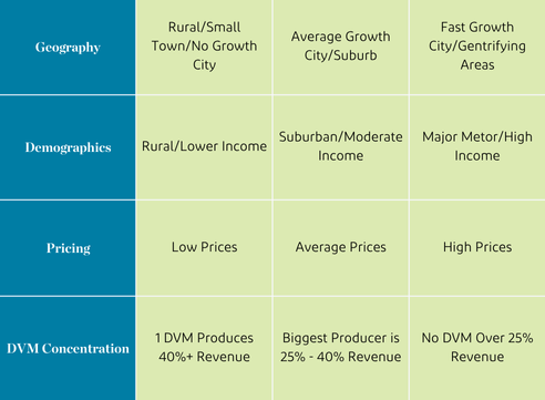 In 2023, the range of multiples that are being paid for veterinary practices is between 8-13x. The practices receiving 12-13x have most of the characteristics shown on the right side of the chart while those selling for 8-9x EBITDA have most of the characteristics shown on the left side of the chart.